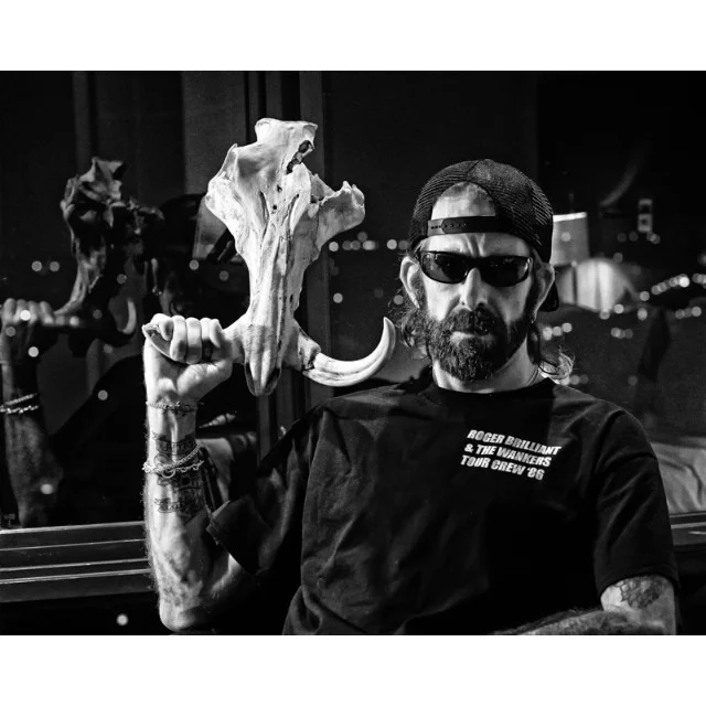 "And so another album cycle comes to an end. This has been a very eventful, at times VERY STRESSFUL, album cycle, & it's been about three years since we started on this one in our practice space- I need a break. Tomorrow is a 19 hour flight back to the USA, & then another one home to RVA, & except for two festival shows in 2014, I will not be thinking about lamb of god, touring, playing heavy metal, writing new lamb of god material- NONE OF THAT STUFF- AT ALL- for a good long while. Time to do other things for a bit, & let my brain regroup, & be a somewhat normal human being. This has been a pretty wild ride though, & to end it in AFRICA of all places still amazes the crap outta me. So thanks Johannesburg for an awesome end to the Resolution tour cycle, & to all you other bands, hear this: the game has been stepped up, & the ante has risen. You are not a REAL G until you come to South Africa & your fans throw one of THESE to you on stage- a warthog skull. Takes the cake for the strangest thing throw at me on stage ever, & I've had some weird shit thrown at me- I named him Jeff. Jeff, the South African warthog. Top that, y'all. Don't front like your ballin' if you ain't rockin' that wart hog shizzy. I figured I'd finish up the cycle with a nice self-portrait. Me & Jeff are outty. Peace, & one love. - Randy"