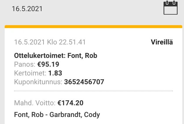Voin nyt paljastaa, että veikkasin aina sillä perusteella, keillä oli matalimmat vedonlyöntikertoimet. En ollut edes kuullut aiemmin useimmista veikkaamistani ottelijoista ja vaihdot johtuivat siitä, että jonkun kerroin oli painunut aiemmin viikolla veikatun alle.