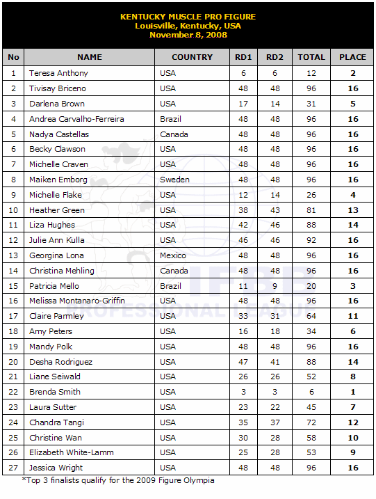 Olen aika tyytyväinen siihen, miltä kärki tässä kisassa näytti. Ihan OK kuntoa, eikä nyt aivan mitään anorektique lookkeja. Smith uransa ensimmäiseen ammattilaisvoittoon ja pienenä yllätyksenä kolmanneksi brassi Patricia Mello, joka on rypenyt noissa alemmilla sijoituksilla tähän asti. Mutta tämä sijoitus kyllä aivan ansaittu. Amy hienosti kuudes :thumbs:
