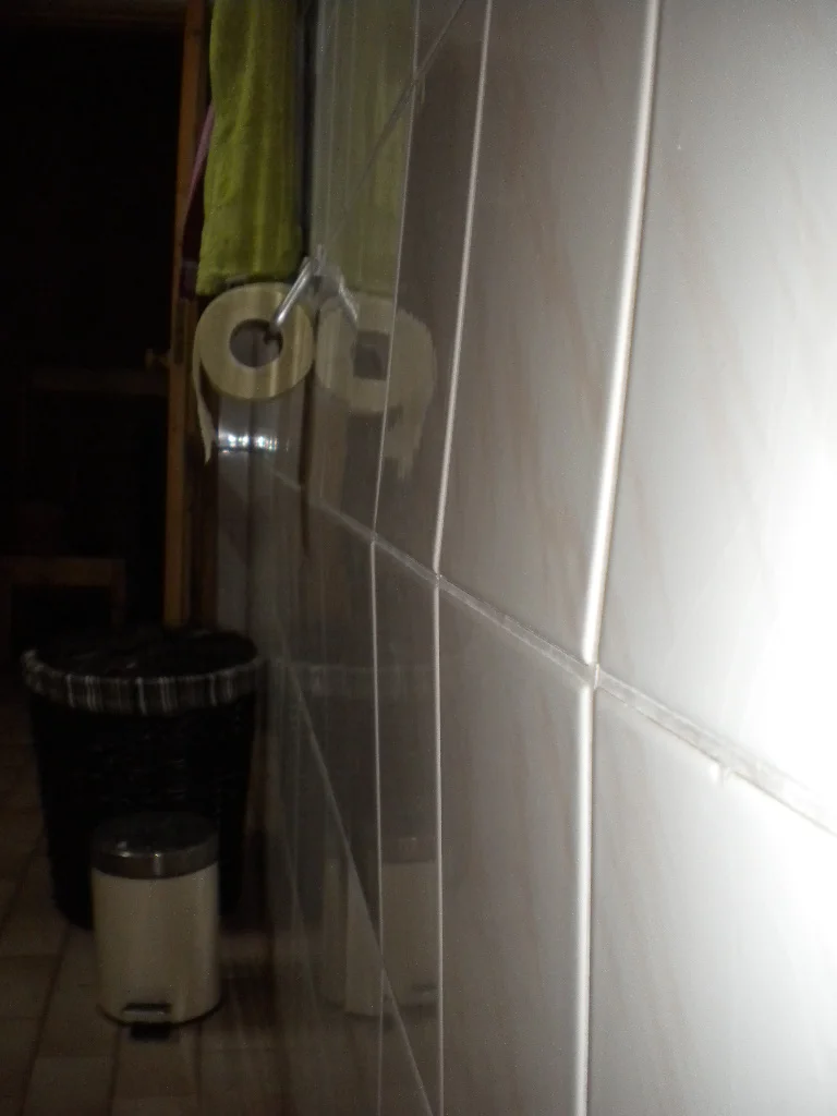 Kylpyhuoneen vastainen seinä on melkein kokonaan savulasia, ainoastaan n. 1,2x0,9 metrin kokoinen pala on paneloitua seinää. Kylpyhuoneen kattoon tulee ledi-spotit.