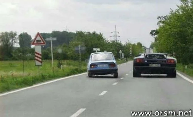 Yritettiin tuota viime kesänä ihan käytännössä. Allamme oli semmoinen about vuoden 89 mazda. Moottoritiellä edessämme n. parinsadan metrin päässä oli joku hieno punainen urheiluauto, joten kiihdyteltiin siinä puskuriin kiinni, jotta nähtiin merkki. No Ferrariksihan se paljastui. Ferrari ajeli kaikessa rauhassa jonkun toisen auton perässä, joten ajateltiin ohittaa, kun ei vauhti meille kelvannut. Heti, kun laitettiin vilkku vasemmalle päälle, niin Ferrarikuski polkas kaasua ja hävis aika hätäseen parinsadan metrin päähän, jossa taas hiljensi sallittuun nopeuteen.