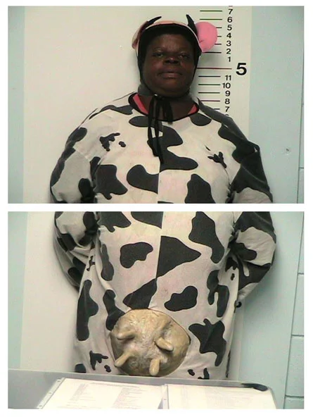 Pienen budjetin feikki-mugshot."The police were called after Michele put on a cow costume, pissed on a neighbor's porch and chased a bunch of children around the neighborhood. "