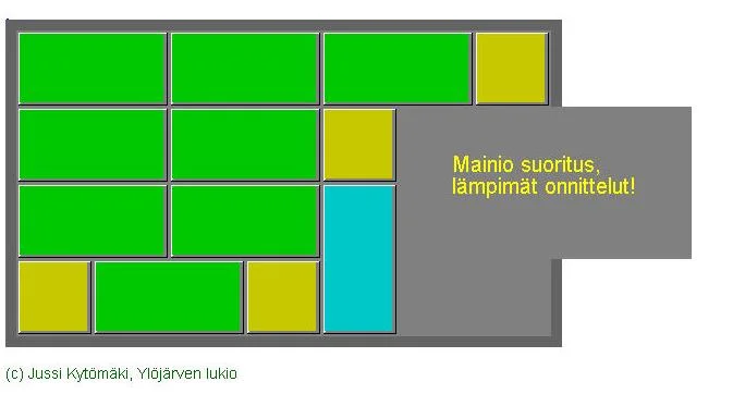Ensin liikuttelet pari keltasta neliötä sinisen mötikän taakse. Sen jälkeen liikuttelet sinistä eteenpäin ja siirrät vihreitä sen taakse. Lopussa sitten täytyy saada vaalensinisen eteen pari keltasta, jonka jälkeen ratkasu onkin käsillä.