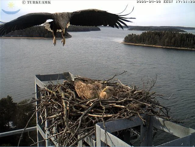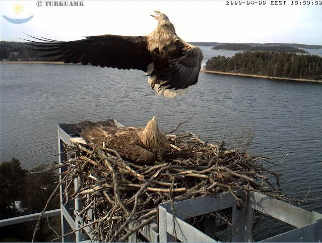 on muuten mielenkiintosta. sitä hetkeä odotan kun näkee samaan aikaan kummatki linnut kamerassa. tossa äsken kymmenen minuutin sisään kävi sääksi tiuhaan tahtiin ja sitten ilmesty merikotka.Ihmettelen suuresti miksi ne siellä käy vuoronperään. Eikö todella toista lajia haittaa se, että pesässä on hetki sitten ollut jotain ylimääräistä?