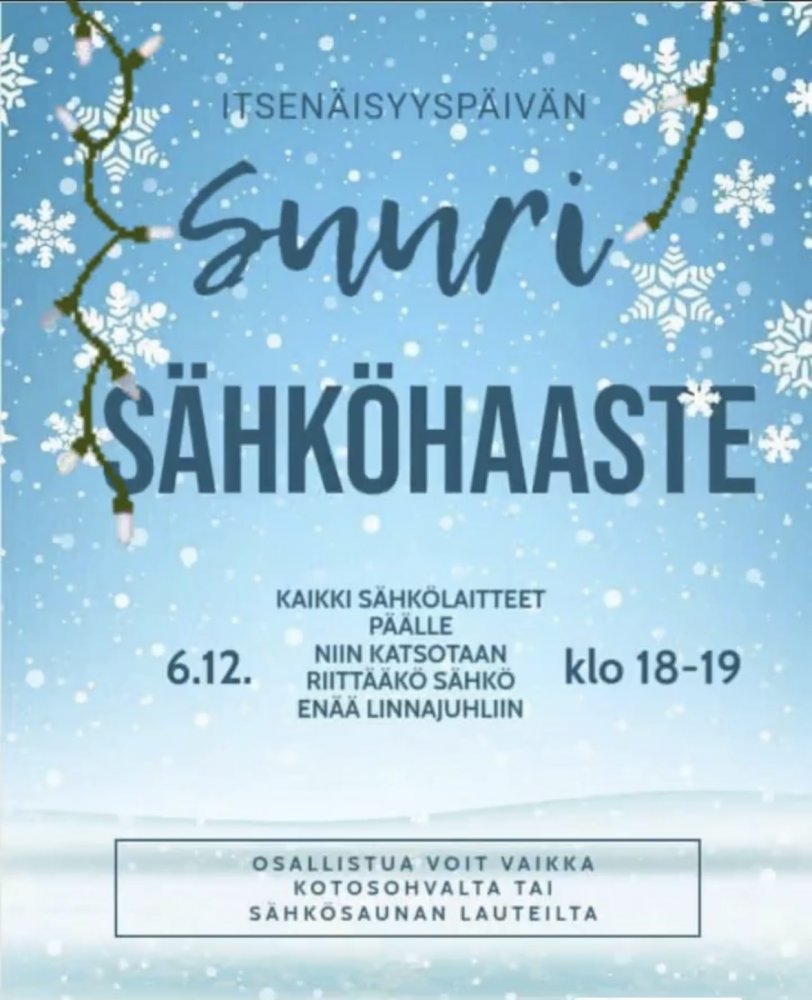 Ihan asiallinen idea mutta täysin väärä päivämäärä. Joku EUn ilmastopäivä tai pakolaispäivä niin osallistun tottakai, lyön vaimon vibran verkkovirtaan turbo settingillä niin kyykkää koko pohjoismainen sähköverkko prkle.