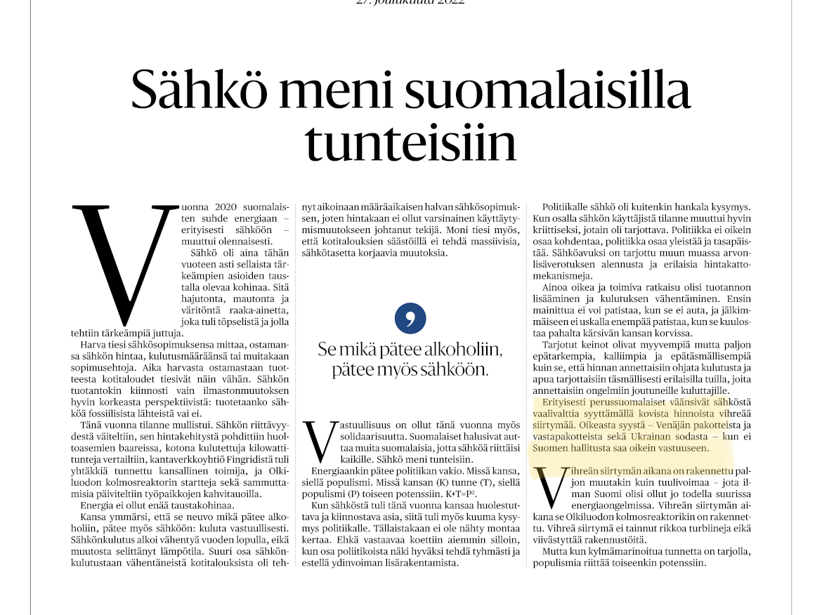 Noin muutenhan artikkeli on persut vastuuttomiksi maalaileva, vihreää siirtymää puolustava, kaiken poliittisen vastuun Putelle sysäävä juttu. Meidän poliitikot tehneet kaiken oikein. Kansa kyllä kuluttaa ja tuhlaa energiaa liikaa, meidän pitää köyhäilä ja maksaa ja kehittää siitä solidaarinen fiilis, niin hyvää tulee. BKT ja teollisuus ihan varmaan kohta nousemassa, koska meidän poliitikot tietää, että ilmastopolitiikalla lähdetään nousuun. :rolleyes: