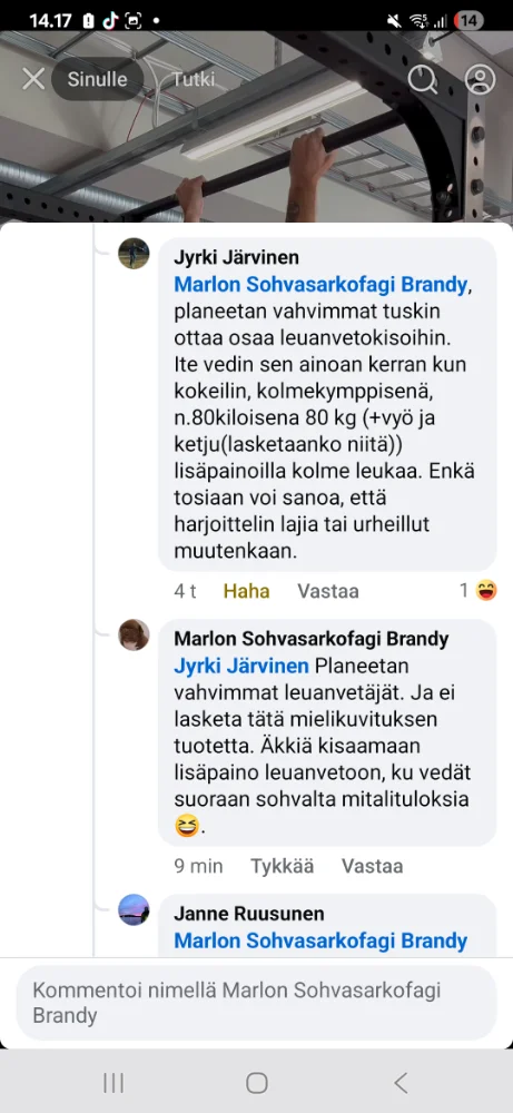 Ei se kertomus välttämättä ole valetta, koska sinä et usko siihen. Yhtä hyvin se voi olla tottakin, sinä vaan olet aasi ja ennakkoluuloinen. Ennen kuin tuomitsee, tulisi tietää lähtökohdat miten ja missä ennätykset on tehty. Jos ei ole tuomaroitu tilaisuus vaan mikä tahansa sätkiminen menee läpi, ei tuo 90 ole mahdottomuus sekään. Alan Ry:n tilastossa 88 on 70 kiloisten ennätys, sen perässä monia jotka on vetäneet yli 60 leukaa tuomareiden edessä. Itse vedin koululiikunnan päätteeksi 18 leukaa, eikä ollut edes luokan paras, sitten armeijan kuntotestissä 23, sekään ei ollut porukan paras, vaikka hyvä tulos olikin. Mutta nuo tuli harjoittelematta, ts. vetelin leukaa joskus landella, kerta viikkoon tms. mutta painoin alle 60 kiloa.