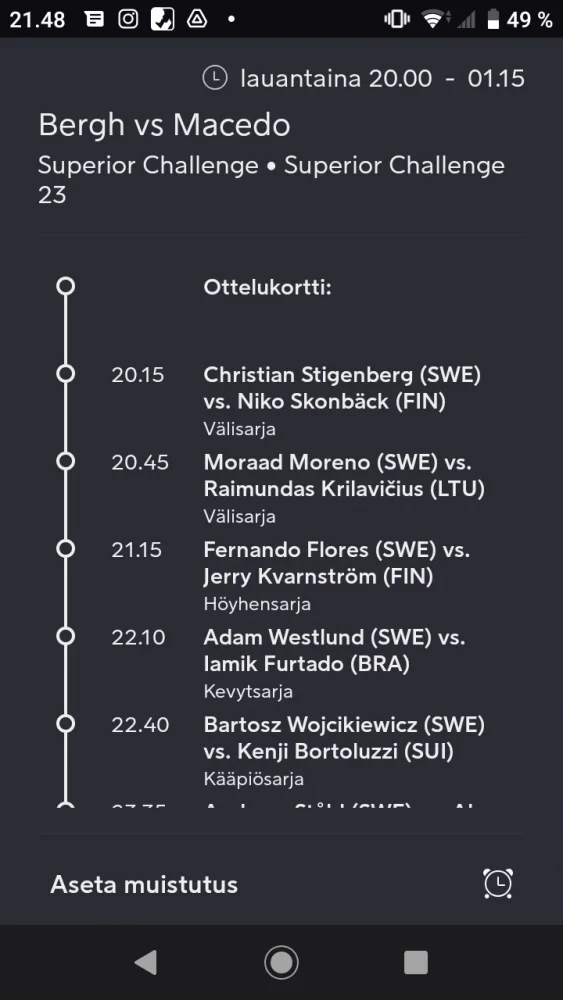 Meni vähän viime tinkaan, kun vastustajat kieltäytyi toinen toisen perään. Kyseinen kaveri otellut harvakseltaan ja taitaa olla sen eka matsi CW:ssa. Taitaa olla sama mies, joka tyrmäsi Puhakan Nikon Careliassa 2016. Jessen matsi perjantain pääkortilla, Edin matsi preleissä. Lauantaina sit Mr.Mäntykivi tulessa.