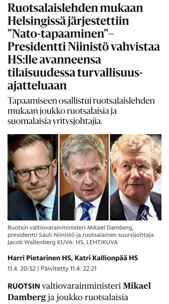 Eipä vaikka Microsoft vetänyt investointiaan Suomeen pois vaikka sota ehti tuolloin olla jo about kuukauden vanha. Kyllä Suomeen investoinnit tai niiden kohdistuminen muualle on ihan muista tekijöistä kiinni, itse asiassa tässä tilanteessa jälleen kerran hallituksen toimintakyvyttömyys haittaa niitä aika pahasti. Suomeen ei kohdistu minkäänlaista välitöntä uhkaa, kaikki resurssit mitä nyt käytetään Nato-jäsenyyteen on pois muista todennäköisesti tärkeämmistä asioista.No mites sellanen, kun talousvaikuttajilta kysyttiin kantaa niin niistä usemmat oli Naton kannalla ihan siitä syystä, että jos ei olla ei tänne uskalleta investoida sitäkään vähää mitä nyt?