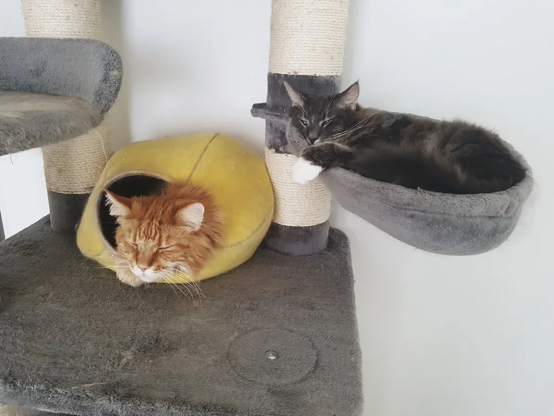 Meijän möllit. Tummempi on Mökö, Norjalainen Metsäkissa ja Vaaleampi on Kasperi, Maine Coon. Molemmat 10v.