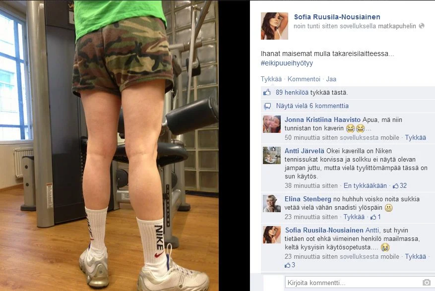 Mutta eipä tuo herra ollut kuvissa tunnistettavissa, kuin pelkästään itse tuolla salillakävijät tunnistaa. Joten siinä mielessä homma lähtenyt pikkasen liikaa laukoille. Kaksplussat ja suomi24 kuhisee, kuinka on säälittävää ja raukkaa ja ja ja paha maailma. Eiköhän se Sofia tajunnut et nyt tapahtu pikku ylilyönti ja pyytäis vaikka henk. koht. anteeksi.