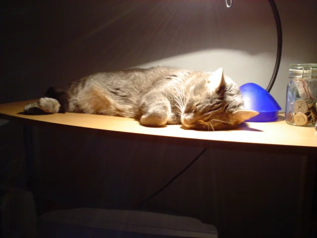 Pistetään nyt sit vielä omasta kissasta kuva. Äijä vetelee sikeitä lempipaikallaan tietokonepöydän päällä tollasen lämpimän lampun alla. :love: :haart: