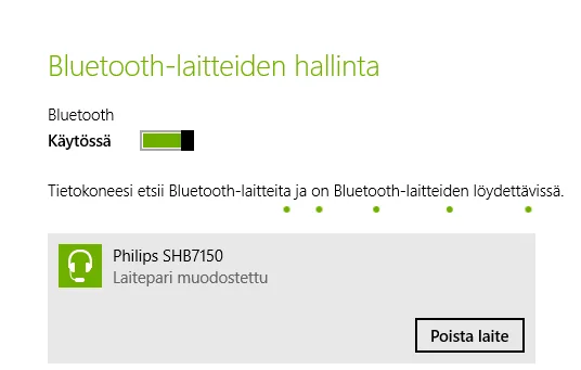 Eli ostin siis Philipsin bluetooth-kuulokkeet. Nämä pitäisi Win8.1 saada toimimaan. Kone löytää kyllä kuulokkeet ja yhdistää laitepariksi: