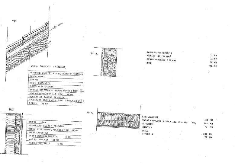 On kyllä melko kirjavan oloinen, välillä on hirttä ja gyproccia, välillä on muovia välissä... Tuo muovin paikka on kyllä aina semmoinen kiistelynaihe, jotku haluavat sen mahdollisimman sisään ja toiset laittavat sen 50mm ja 150mm villan väliin (firmassa jossa ite olen ollut niin tuo jälkimmäinen on se jota totetettu), perusteluita tuolle muovin paikalle tuossa välissä en kyllä muista...