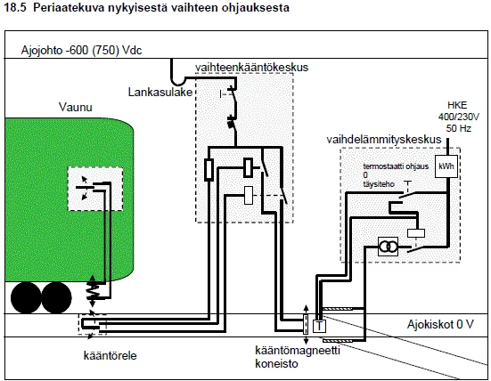 "Vaihdetta käännettäessä käyttää kuljettaja ohjaamoon sijoitettua kääntökytkintä, jolloin kiskojen välissä oleva kääntörele magneettikentän vaikutuksesta toimii ja ohjaa vaihteenkääntöreleistöä vaunun kulkiessa kääntöreleen yli. Vaihde kääntyy siihen suuntaan mihin kääntökytkin on käännetty."