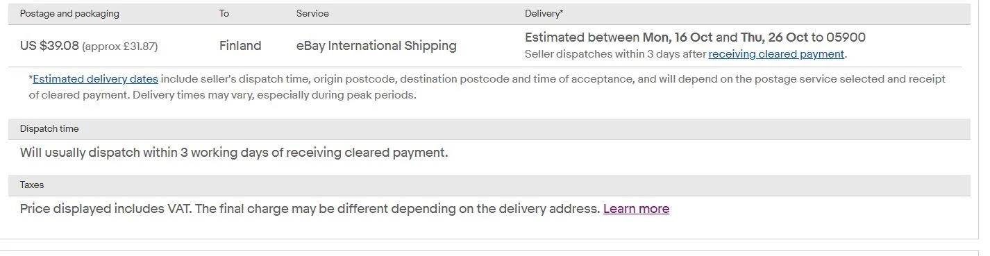Tuohon tulee alv lisäksi, kun menet ebayssä maksamaan ostoksia.Nii emt näistä. Ku välil näissä kohteissa ei näy ollenkaan ku pelkkä tuotteen perushinta. Tossa kuitenki näkyy tollanenki.