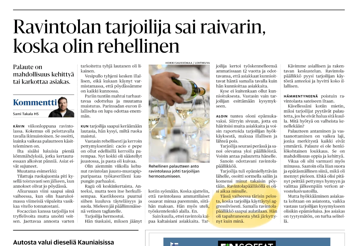 Huvittaa toi että tärisi pelosta kun tarjoilija osotti sormella.