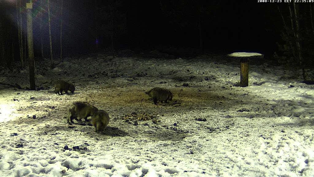 21:45 äsken kävi ruokapaikalla jotain ihme supikoiria tms.! Ja nyt tuli pari possua paikalle, koirat läks.