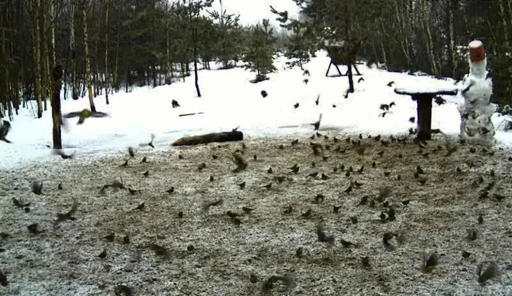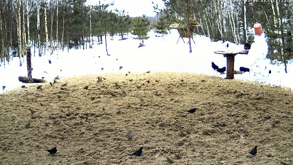 13:25 ainakin 7kpl korppeja tai mustavariksia ruokailemassa. kiusaavat vuorotellen tolpan päällä aterioivaa haukkaa. myös yksi harakka pyörii joukossa sekä parvi pikkulintuja.