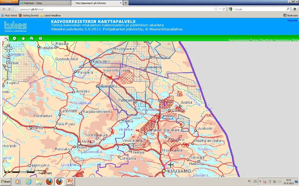 Itseä vituttaa tällä hetkellä Suomen nykyinen kaivoslaki, jonka ansiosta ulkomaalaiset kaivosyhtiöt saavat kaikessa rauhassa rellestää täällä! Kaikki malmi ja raha menevät ulkomaille. Eräällä australialaisella kaivosyhtiöllä on kotipaikkakuntani Kuusamon varalle tehtyjä suunnitelmia, jotka tulevat ilmi alla olevasta kuvasta. Kuva on siis virallinen TUKESin varaus-, valtaus- ja kaivospiiri kartta koskien puolta Kuusamoa, Posiota ja Sallaa. Myös Oulangan kanjoniin on suunnitteilla kairauksia. Kyseessä on vielä kunta, jossa sijaitsee muun muassa maan tunnetuin kansallispuisto (Oulanka) ja matkailukeskus (Ruka) ja joka elää matkailusta. Kunnan slogani on vielä "luonnon oma huvipuisto". Tähän kuvioon ei mun mielestä sovi uraanikaivos...