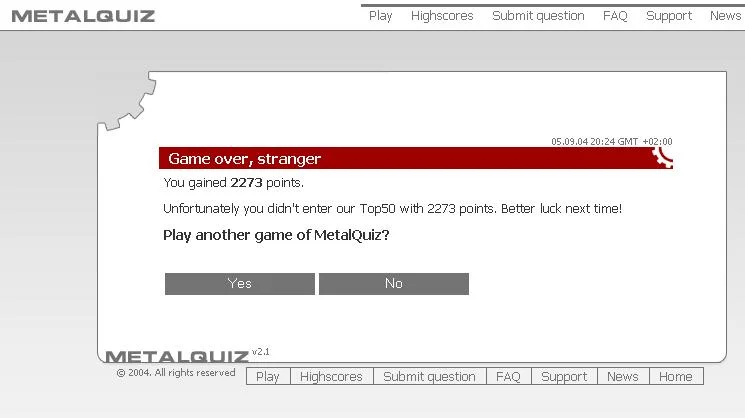 hash pipe Liittynyt 1.9.2002 Viestejä 608 27.8.2004 #1 http://www.metalquiz.com/ Jos on vanha, niin roskiin vaan.