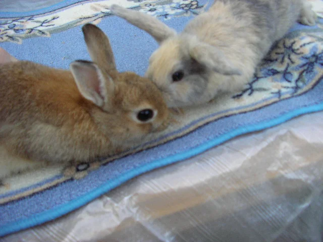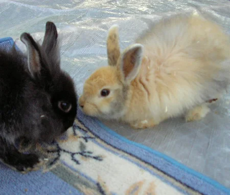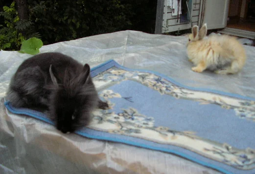 Ekoissa kuvissa siis Eppun (luonnonkeltainen/luonnonharmaa hermeliini-uros) ja Tessa (sinikeltainen japanilainen, kääpiöluppa-neiti). Kahdessa viimeisessä puolestaan Pulla (musta risteystys-poju, jossa iso osa leijonaharjasta) ja Fanny (mustakeltainen Jamora (kääpiöangora)-neiti)..