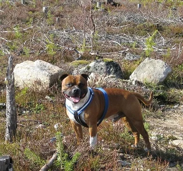 Onhan se aika kookas kaveri, painoa sellaset 24kg. Ihmiset kyselee, että onko tuo staffi vai amstaffi...:D Ja siis staffihan Onni on.