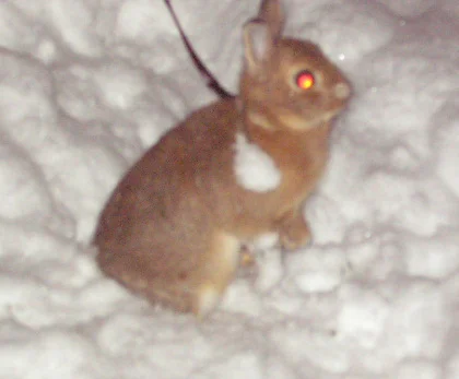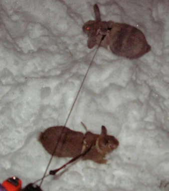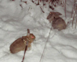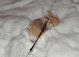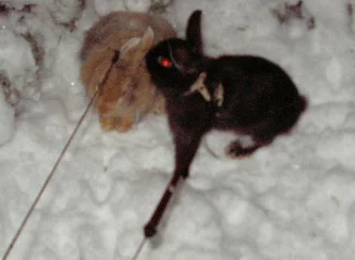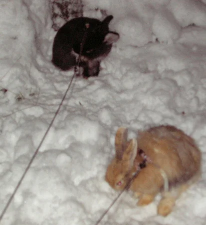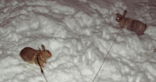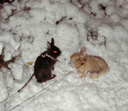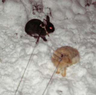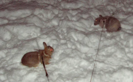 Pakko kysyä, että miten oot totuttanut ne kylmään? Ootko pitänyt ulkona ihan lumeentuloon asti, vai miten uskallat viedä ne hankeen? Tiedän, että kanin karva paksunee, jos se tottuu kylmään, mutta meijän "kesäulkoilijoita" en kyllä hankeen uskaltais viedä, nuha tulee vähemmästäkin.