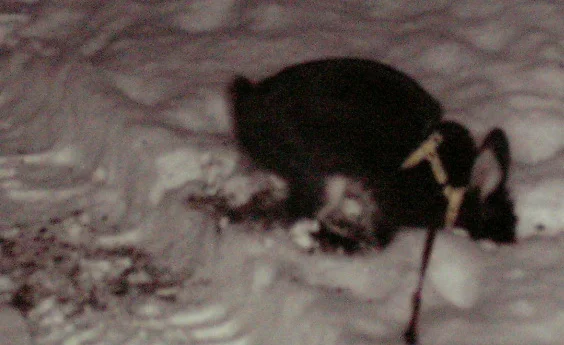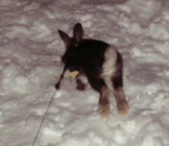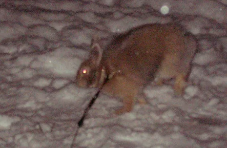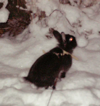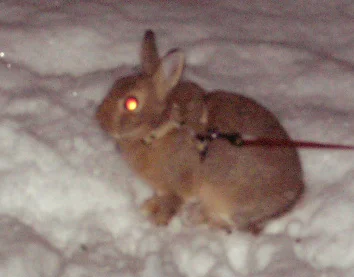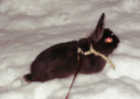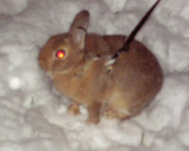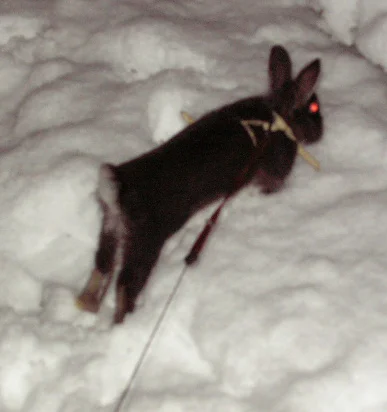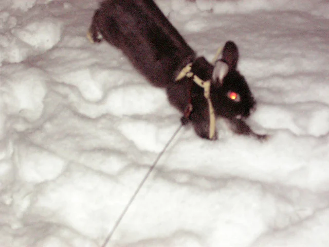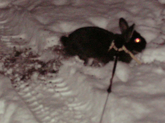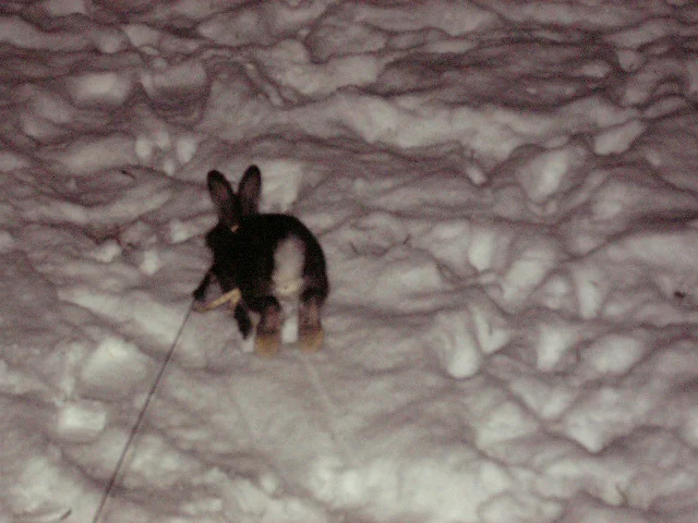 No niin! Tässä näitä lumileikkejä Pullan kanssa. Ei meinannut meikätyttö pysyä pojan perässä niin vauhdilla touhuttiin. Hups, oltiin inasen reilu tunti tuolla pihalla. Kivaa oli! :hyper:. Sain ihmetteleviä katseita kun musta pupu ravailee kovaa vauhtia valkoisella lumella. Muutama pariskunta tuli jopa ihan ihmettelemään ja totesivat etteivät ole ennen nähneet kania valjaissa saatika sitten lumessa :). No, aina oppii uutta :D.
