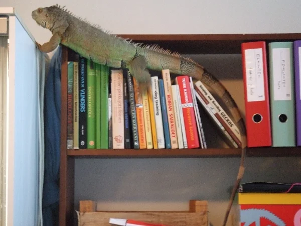 Luulen, että kesympi iguaani voisi oppia enemmänkin juttuja. Olen haaveillut, että jossain vaiheessa ottaisin suht pienen poikasen ja kesyttäisin sen kunnolla alusta asti. Mutta ehkä sitten kun tuosta vanhasta aika jättää. Kaksi iguaania vie turhan paljon tilaa.