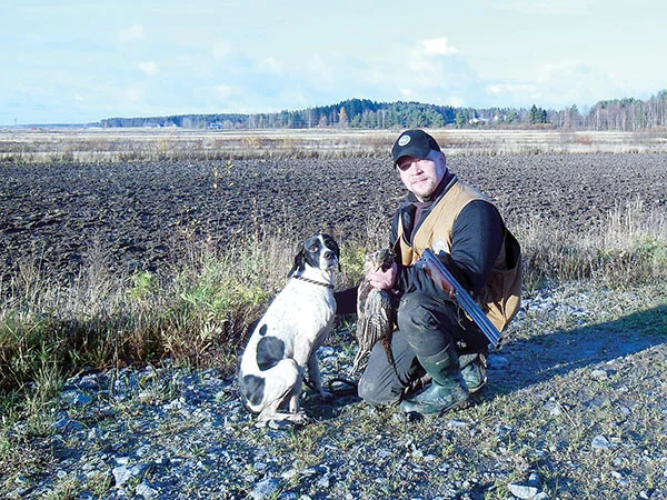Peli jatkuu ja Siinnon parina Sumun 12. erä ja Siinnon 10. starttaa viljakuivurin kupeesta Alajärventien ja junaradan väliseltä alueelta. Siinto meinaa junaradan varressa pilata Sumun päivän lopullisesti, mutta onneksemme linnut eivät Siinnon seisontaa kestä ja koiran hämmästellessä lintujen lentoa paikallaan, jatkui erä eteenpäin. Viimeiset seisonnat saatiin kuivurin toisella polen, jolloin Siinto ja Sumu ottaa lähes yhtäaikaiset seisonnat linnuille pellon eri päissä. Keijon ilmoittaessa hivenen ennen seisontansa arvostelee tuomari ensin sen lintutyön. Homma hoidetaan korrektisti, linnun siivittyessä kuivuria ja autoja kohden jättää Keijo ampumatta kohti, ja lintu jatkaa matkaa kunnialaukauksen saattelemana. Nyt tuomarilta heltiää aikaa Sumun seisonnallekin ja siirrymme paikalle. Talon ollessa vajaan 100m päässä seisontapaikasta, ottaa tuomari puhelimen käteensä ja soittaa siinä asuvalle henkilölle. Luvan hellittyä riistatyöhön, asteli ohjaaja varmuuden vuoksi vielä talon puolelle koirasta, ettei vahinkoja tapahdu. Hivenen tahmeahko avanssi, fasaanikukko ilmaan ja 1. tonttiin. Toisella paikko juoksuun yrittävään lintuun maahan ja ohjaaja muisti tässä kohdassa sanoa koirallekin jotain. Sumu meinasi lähteä hakuun, mutta komentamalla rauhallisesti paikallaan olo jatkui. Tuomarin luvalla nouto, joka ei lainattujen sanojen mukaan “silmiä hivele, mutta riista tulee ohjaajalle” ja peli oli selvä. Haluan kiittää erityisesti Jorma Rissasta kokeen läpiviennin mahdollistamisesta ja kanssakilpailija Keijo Uusimäkeä hyvästä ‘veljestenvälisestä’ kamppailusta. Tuomarille pitää antaa myös kiitos siitä, että hän jaksoi koiria arvostella näinkin pitkään, vaikka yleensä 3 koiran kokeet ovat nopeammin ohi. Tulos oli se, mihin tiesin koiran kykenevän jos kaikki muu loksahtaa kokeen aikana paikoilleen. Nyt näin kävi ja kilpailuluokka saa meistä kohtuullisen aktiivisen Ekipagen syksylle 2013."