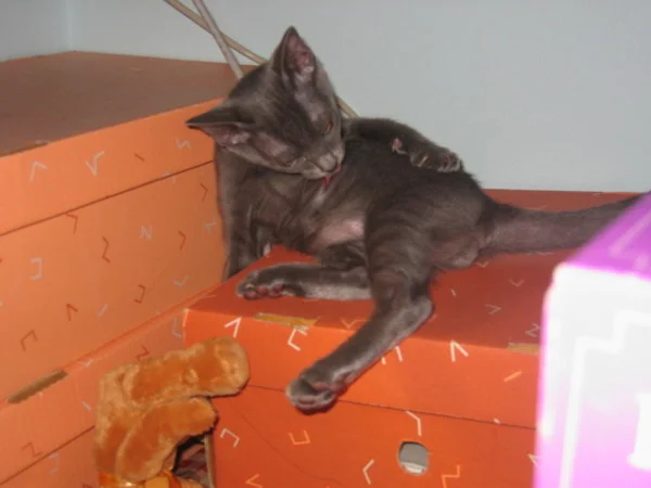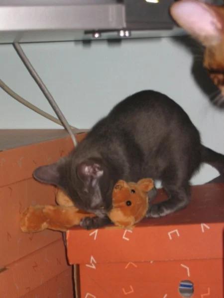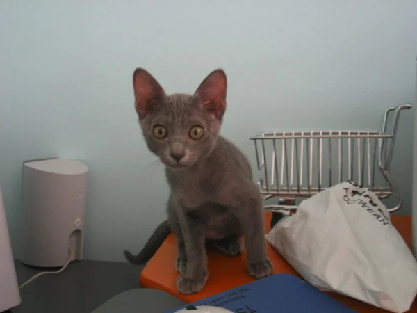 Eilen sitten tuli meidän perheeseen Kaarlo pentu. Se on Korat rotuinen pikku rääpäle :) Harald on yrittänyt sen kanssa leikkiä, mutta vielä se on sen verran ujo, että sähisee vain "pois läheltä"... Haraldin kanssa oltiin eilen myös ensimmäisessä näyttelyssä ja se hurmasi siellä ihmisiä rennolla asenteellaan ;)