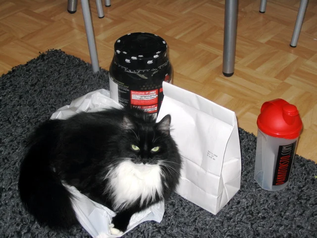 Perheen karvaisimmaltakin yksilöltä tuntui tulevan hyväksyntä Pakkis-shopista haetuille ostoksille (kts. liite). Täytyy pitää purkit kaapissa niin ei kissaneito syö kaikkea :D